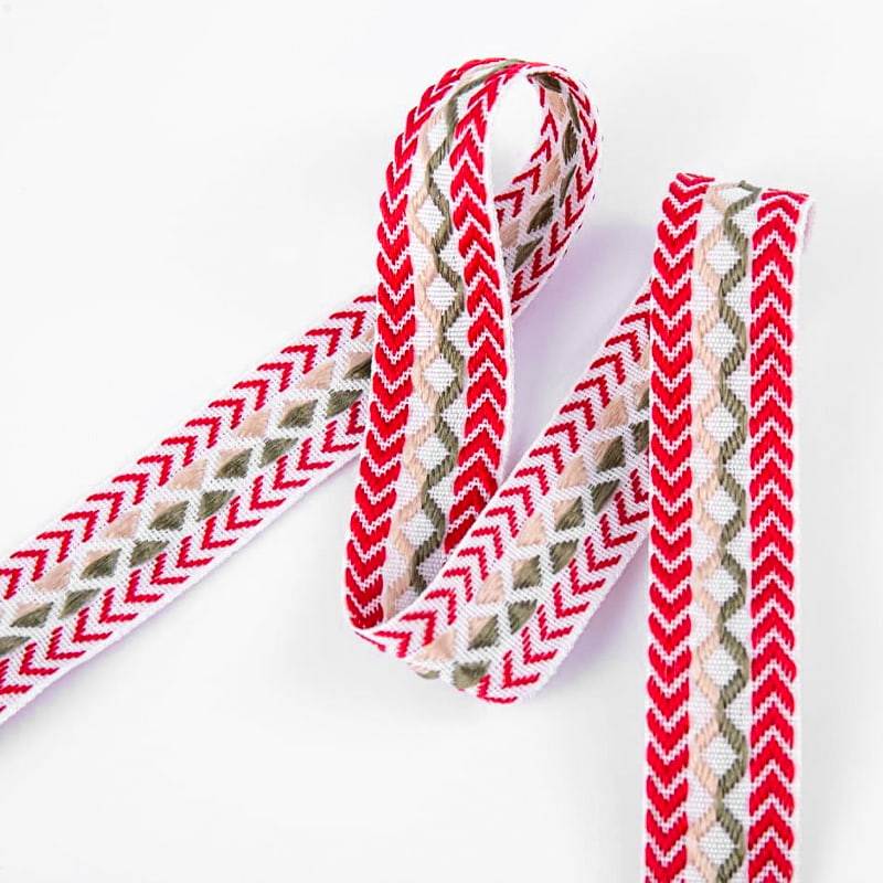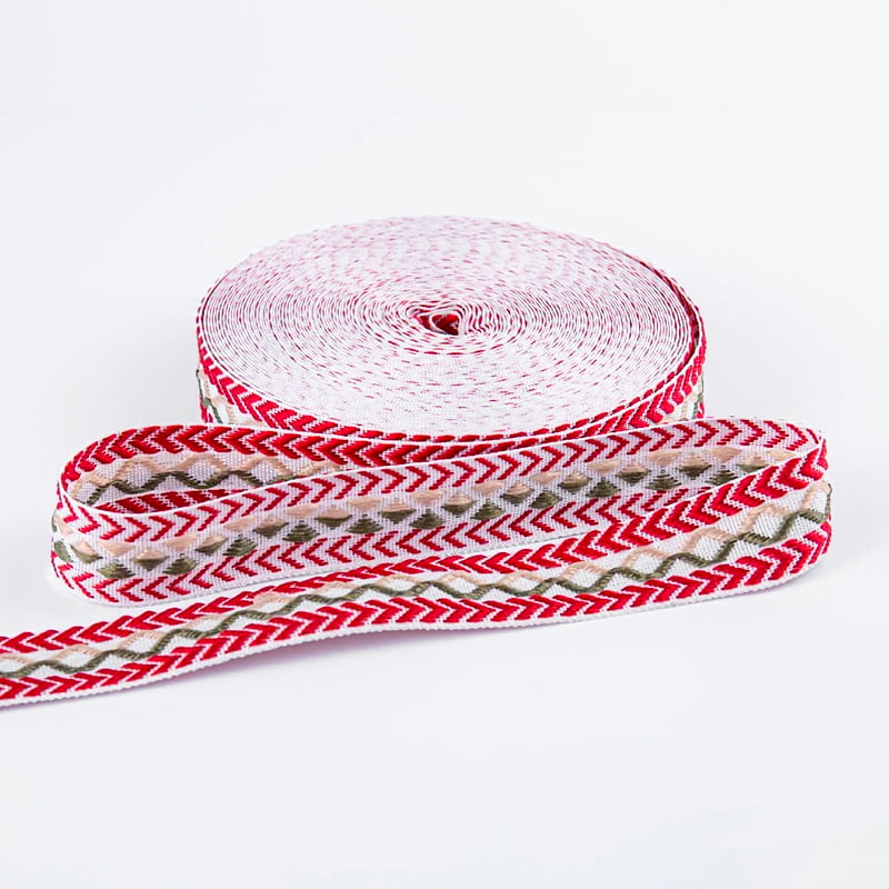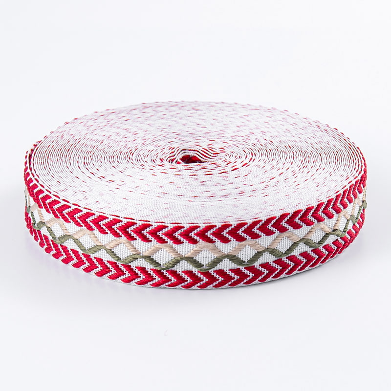 สายรัดแจ็คการ์ดโอเวอร์ล็อคกว้าง 2.5 ซม. สองด้านนี้โดดเด่นด้วยลวดลายแจ็คการ์ดสองด้าน เผยให้เห็นลวดลายอันงดงามทั้งสองด้าน มีความงดงามทางสายตาและงานฝีมือที่โดดเด่น ผลิตจากเส้นด้ายตาข่ายระดับพรีเมี่ยมและผสมผสานกับเทคโนโลยีแจ็คการ์ดขั้นสูง ผสมผสานความสวยงามเข้ากับการใช้งาน ทำให้เหมาะสำหรับเครื่องนอนระดับไฮเอนด์ ของตกแต่งบ้าน และผลิตภัณฑ์สั่งทำพิเศษ
